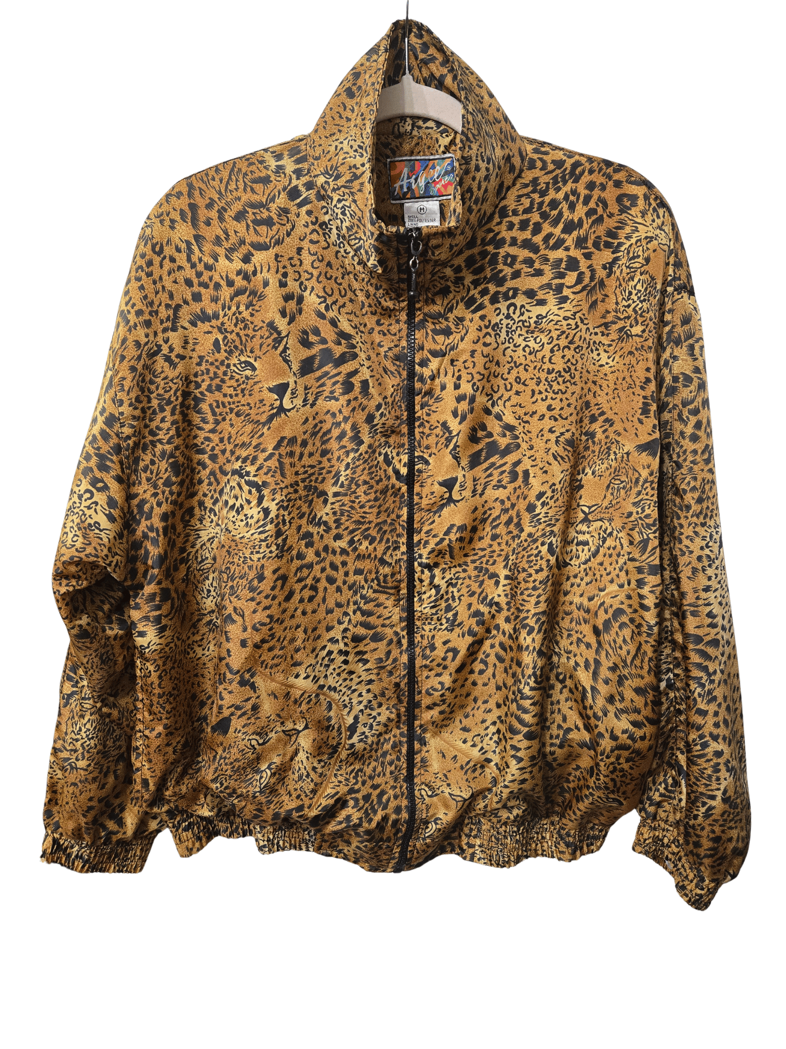 -Brown/Black animal print; zipper to secure; 2 pockets; lined on inside; elastic bottom and sleeve cuffs