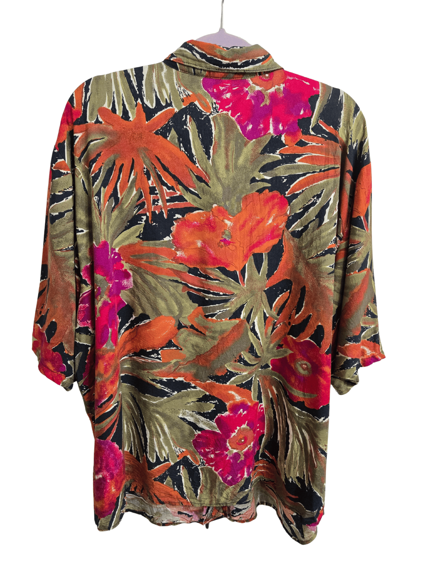 - Orange/Pink/Purple/Green/Black tropical floral print; 7 black buttons