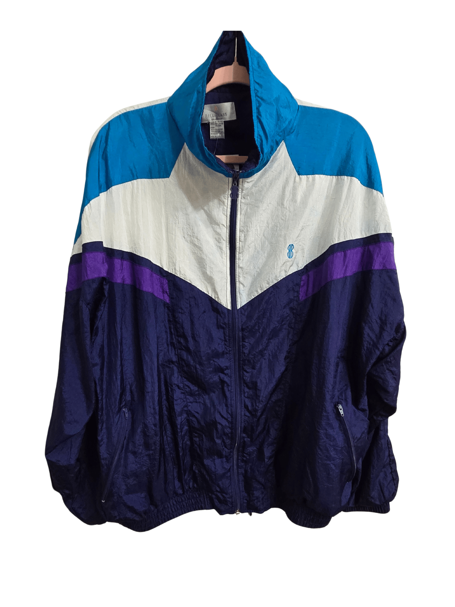 - Navy/White/Teal/Purple colors; zipper to secure; 2 zipper pockets; lined on inside; elastic bottom and sleeve cuffs