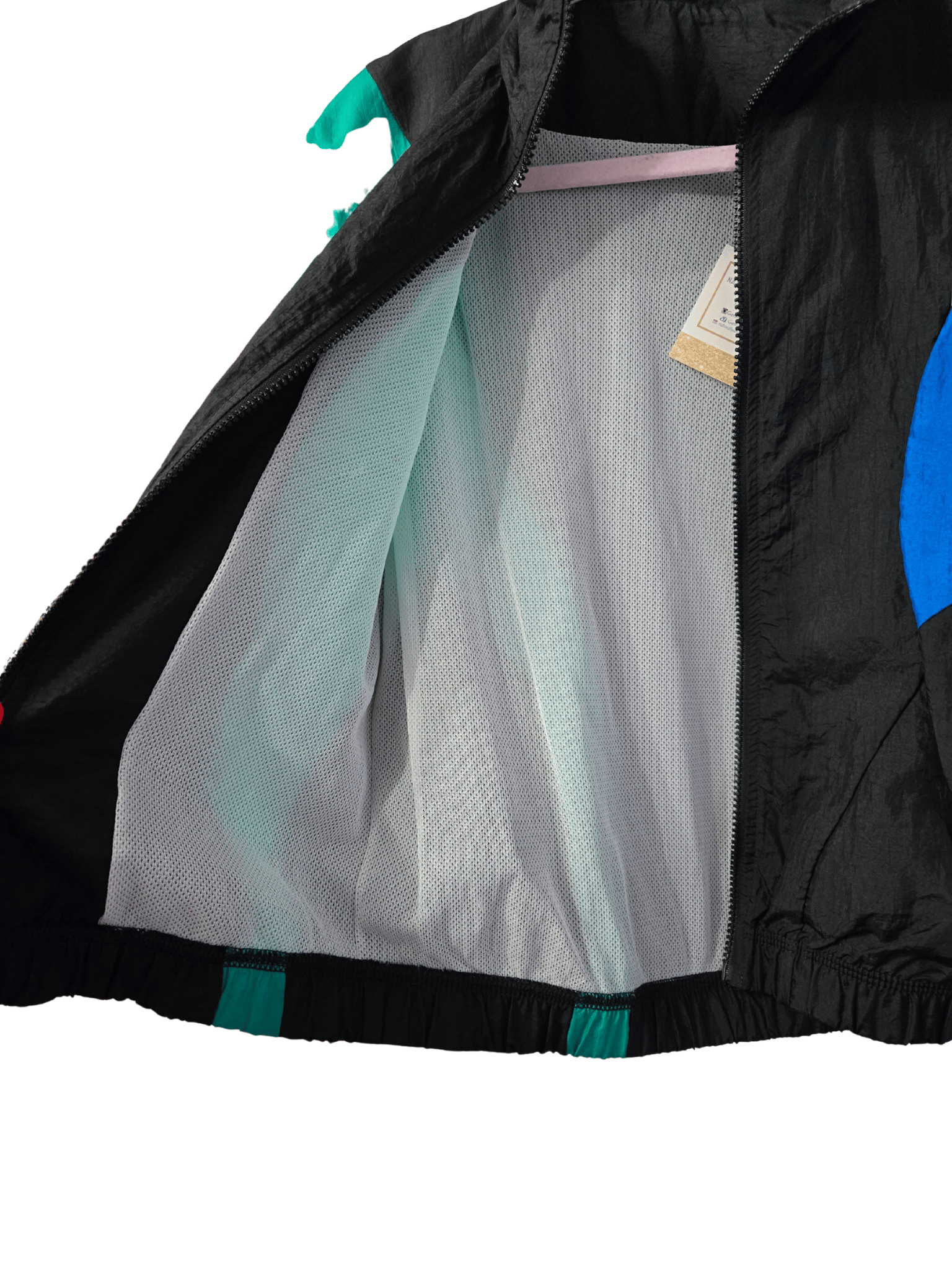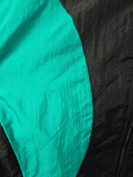 -Pink/Black/Green colors; black zipper to secure; 2 side pockets; lined on inside; elastic bottom and sleeve cuffs; small mark on front green part pictured