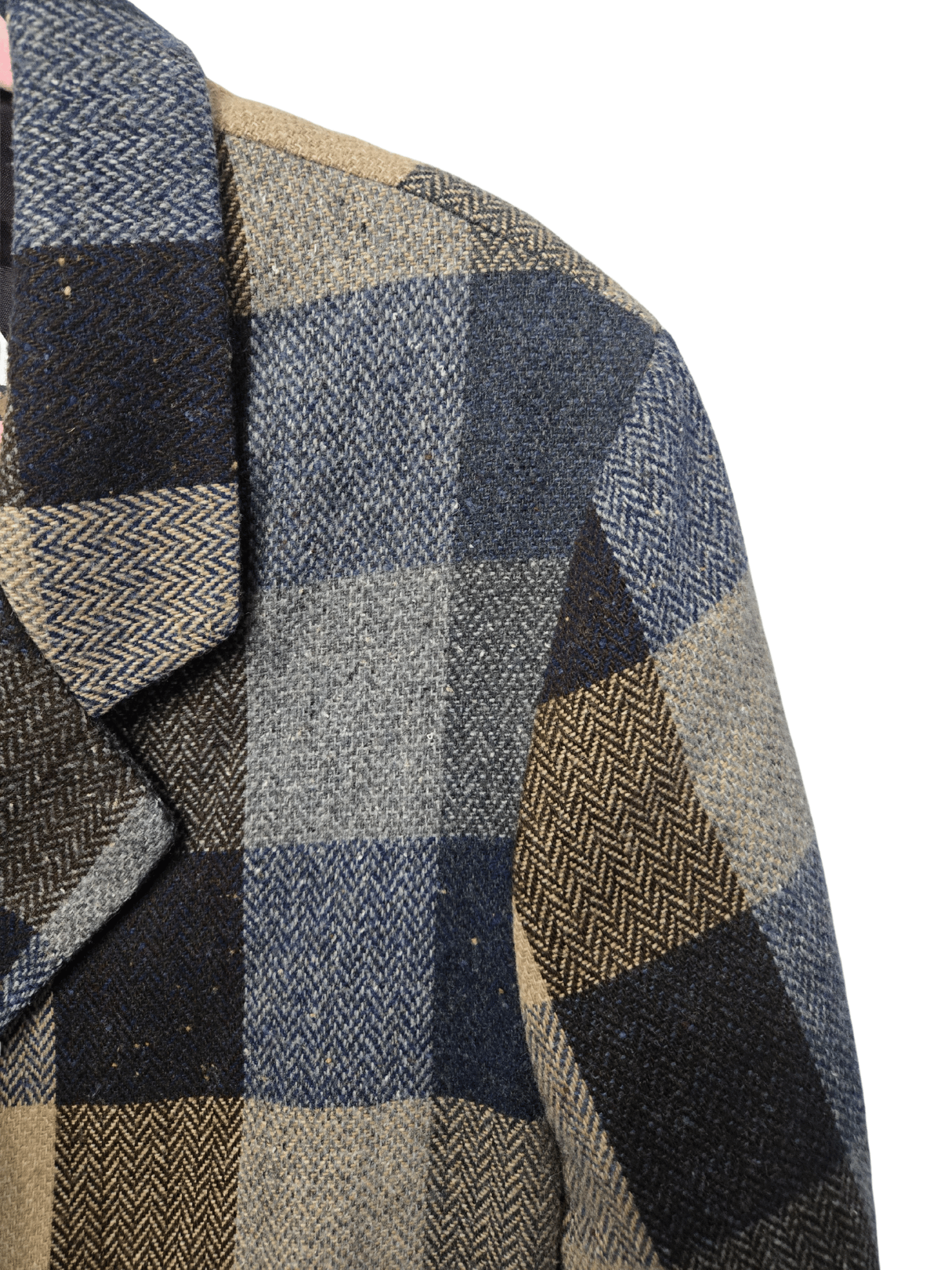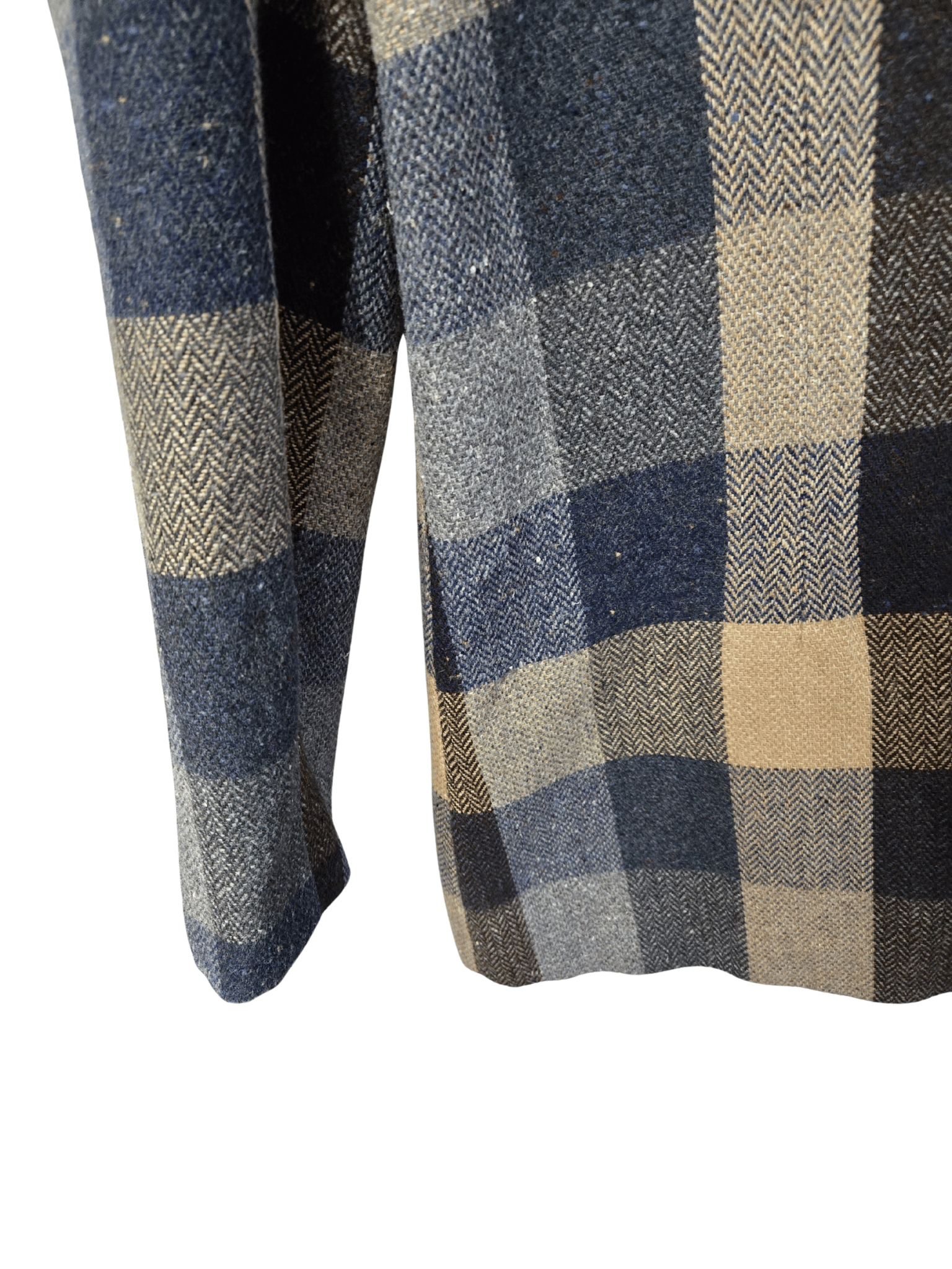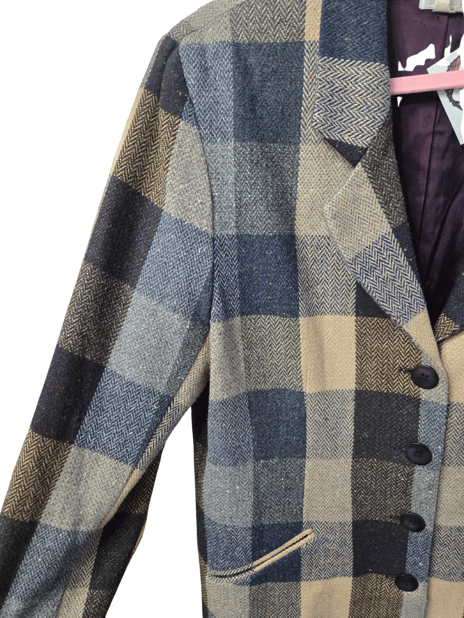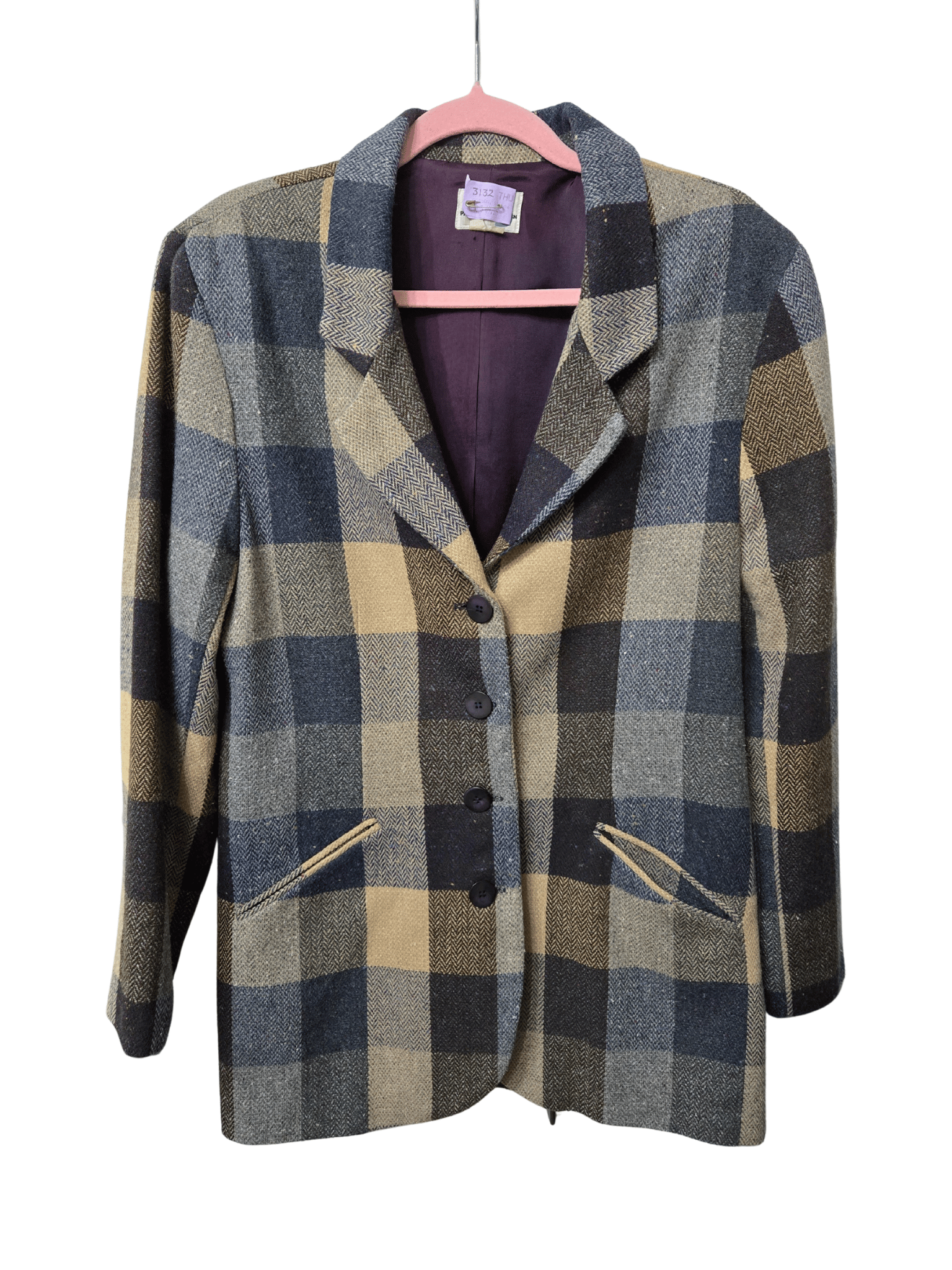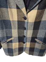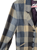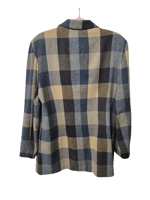 -Tan/Grey/Brown plaid design; 4 buttons to secure; lite non removable shoulder pads; 2 front pockets; has been dry-cleaned