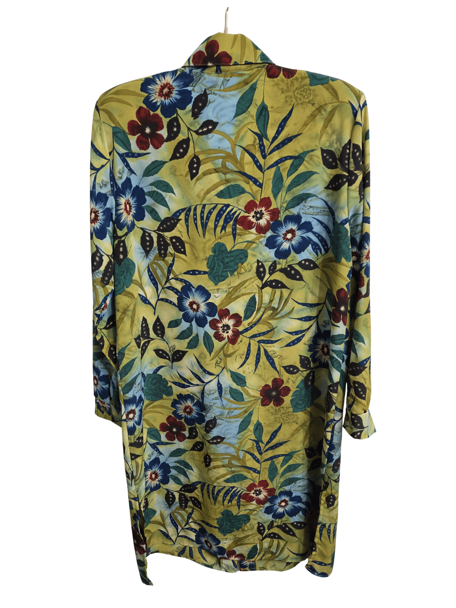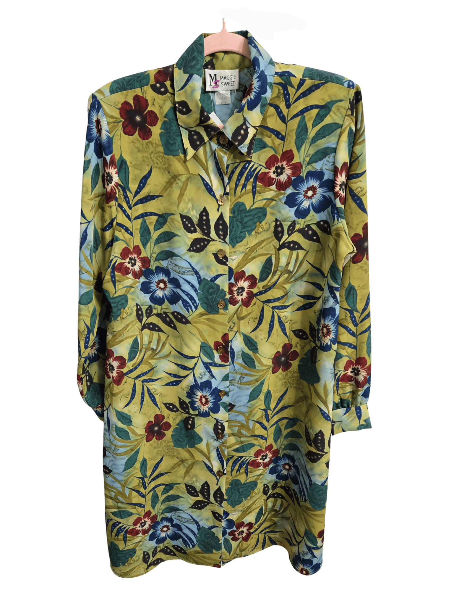 - Green with red/blue/brown/cream floral print; 8 green buttons; missing very top button; removable shoulder pads/can be worn as a duster