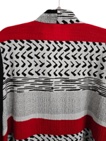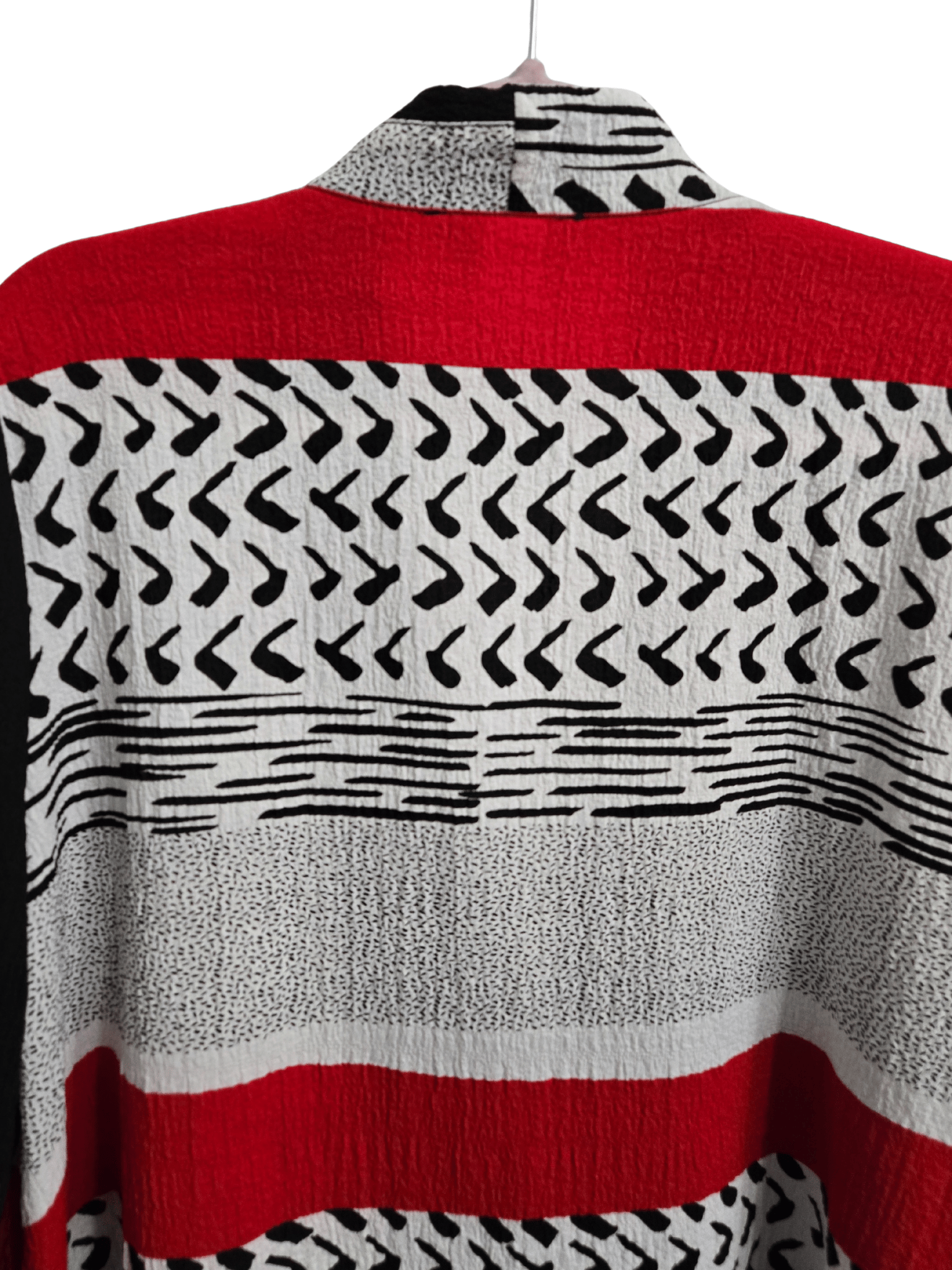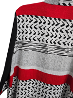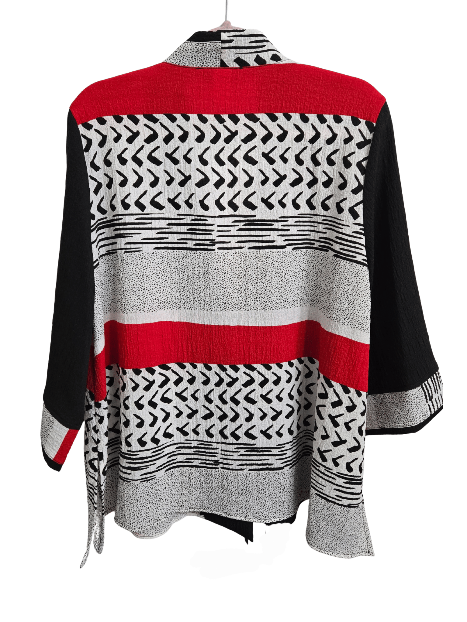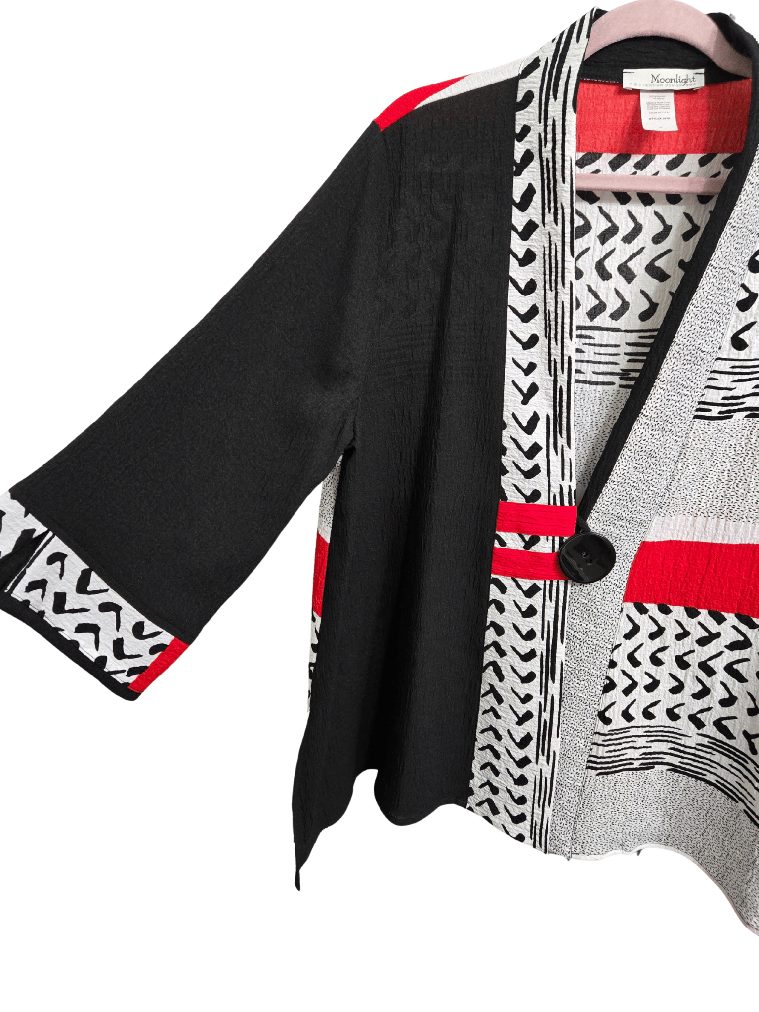 - Black/Red/White print; 1 large black button; quarter length sleeve; has stretch