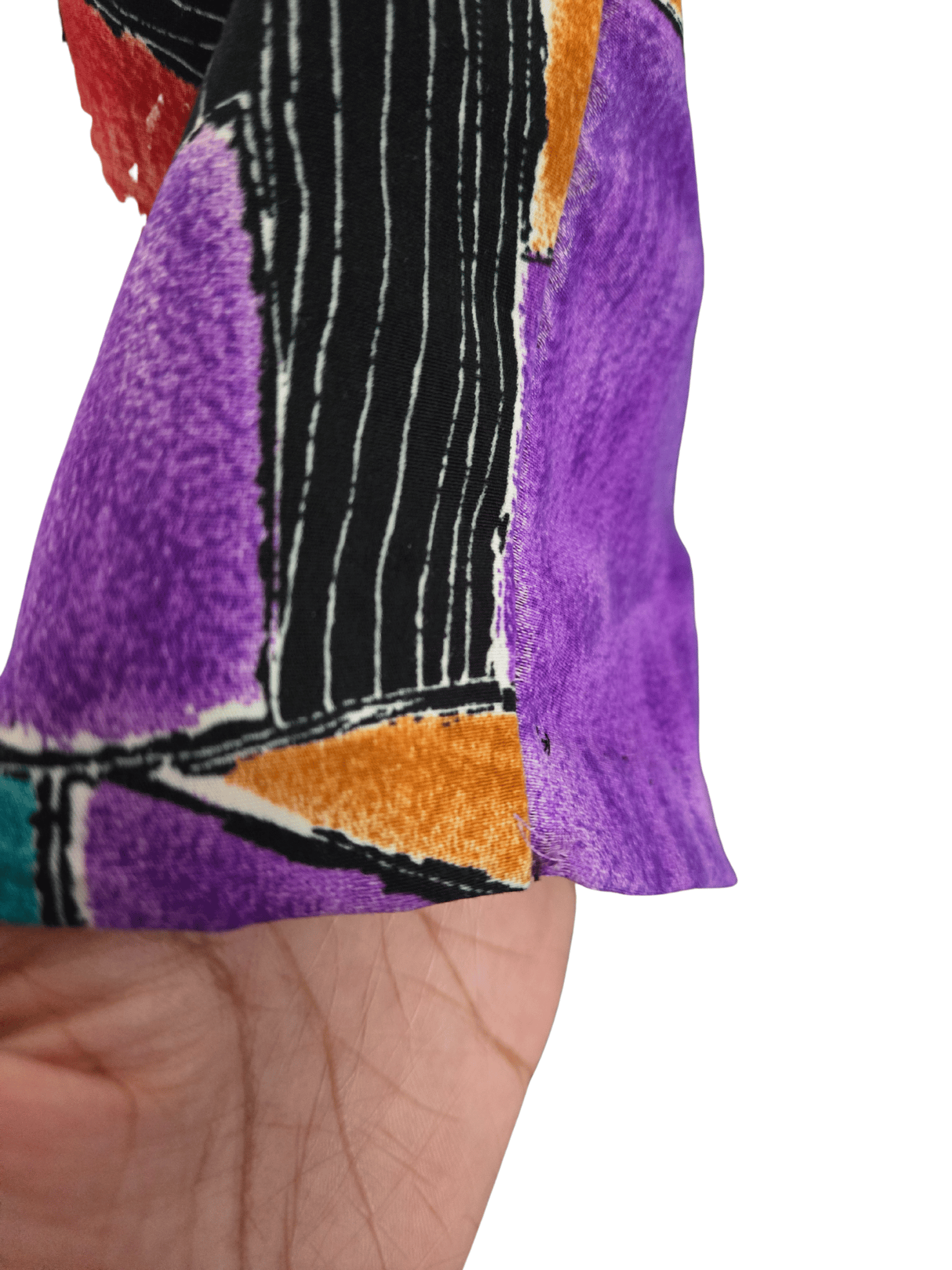 -Purple/Red/Teal/Brown/Black abstract print; 4 buttons, small flaw on bottom side of both sleeves but not noticeable and can be folded