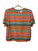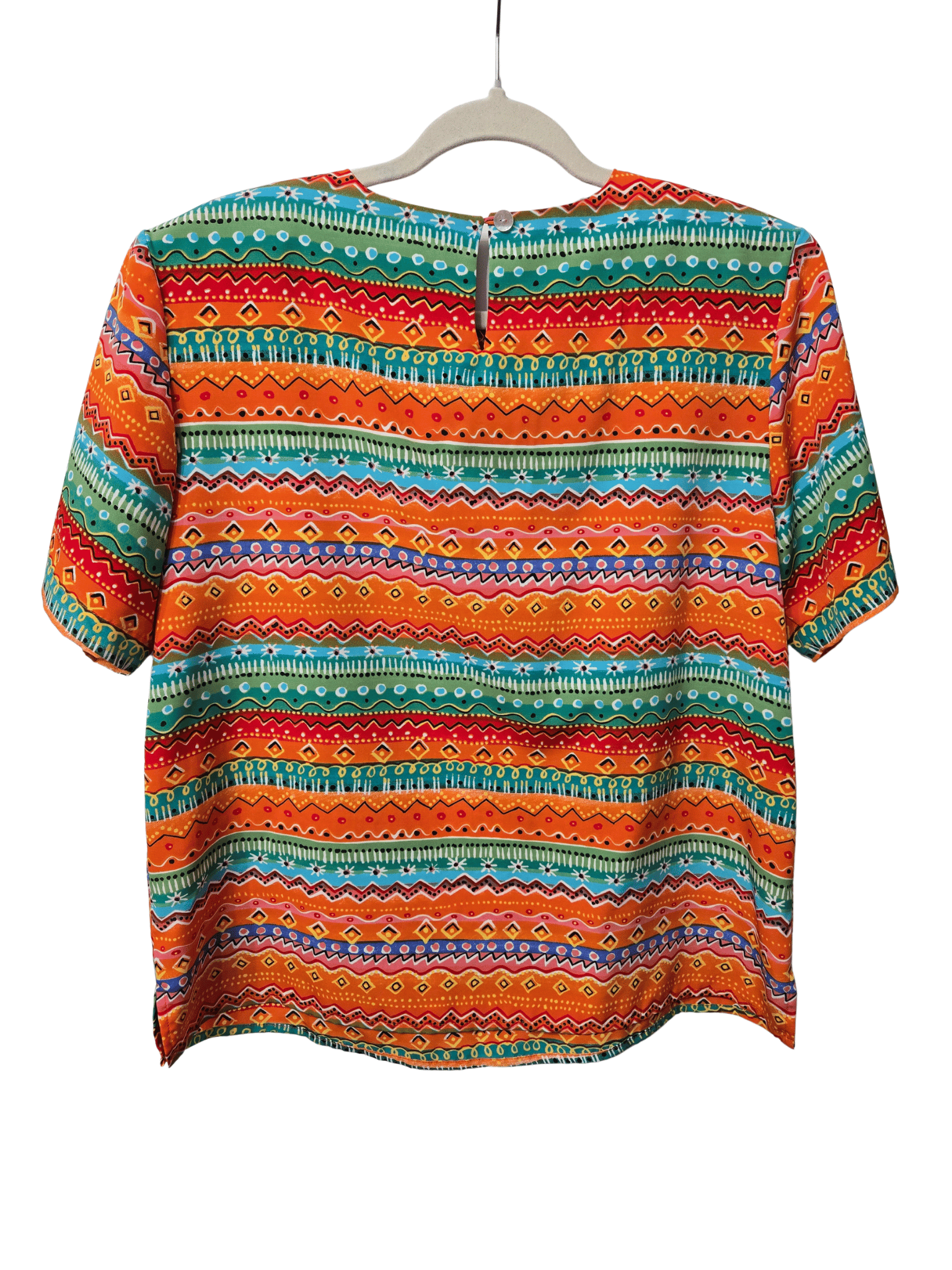 - Blue/orange/yellow/white/green/red colors & prints ; removable shoulder pads, 1 button to secure in back; pull-over style shirt