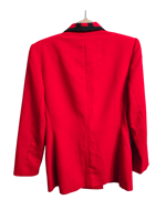 -Solid Red with black design on collar; double breasted; 6 blk buttons & 1 hidden button to secure; Non removable shoulder pads; Has small black mark on side of sleeve pictured