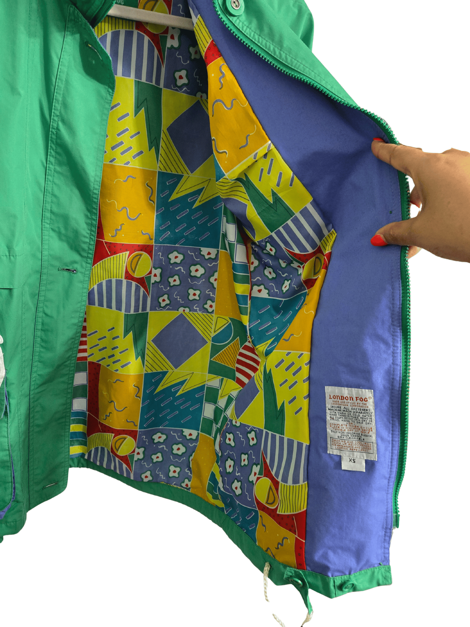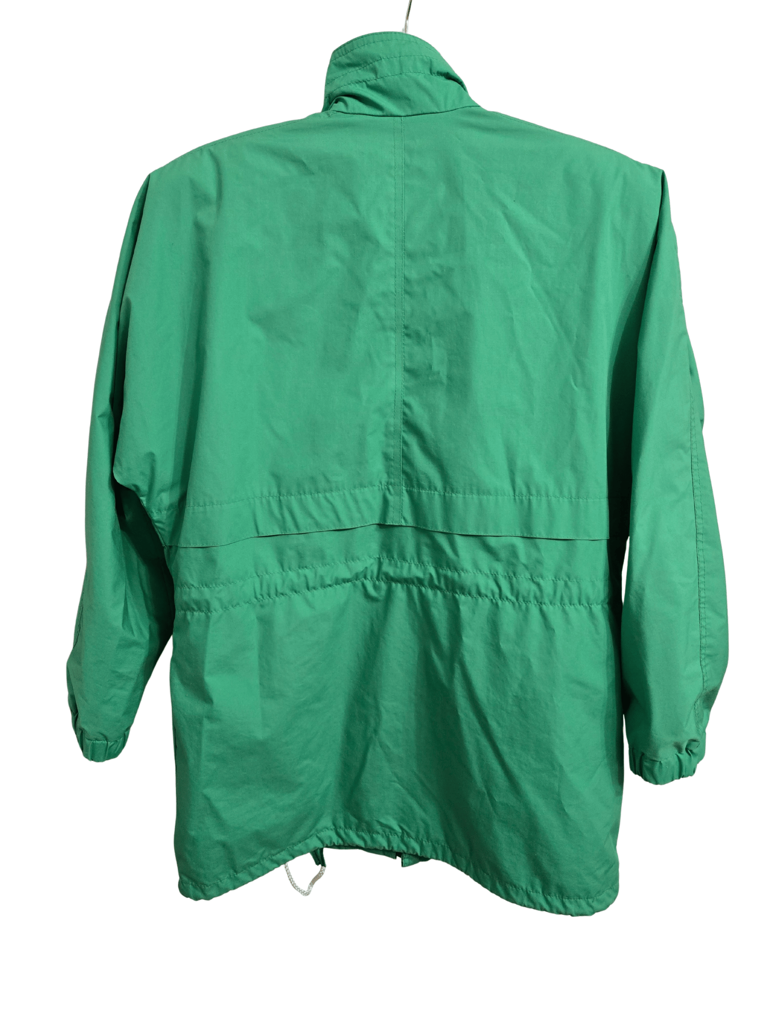 -Green with blue collar lining and pop of peek-a-boo white on shoulder; zipper & 3 buttons to secure; 4 pockets; colorful lining on inside; elastic sleeve cuffs, drawsting waisit and bottom you can use to make jacket tighter; non removable shoulder pads