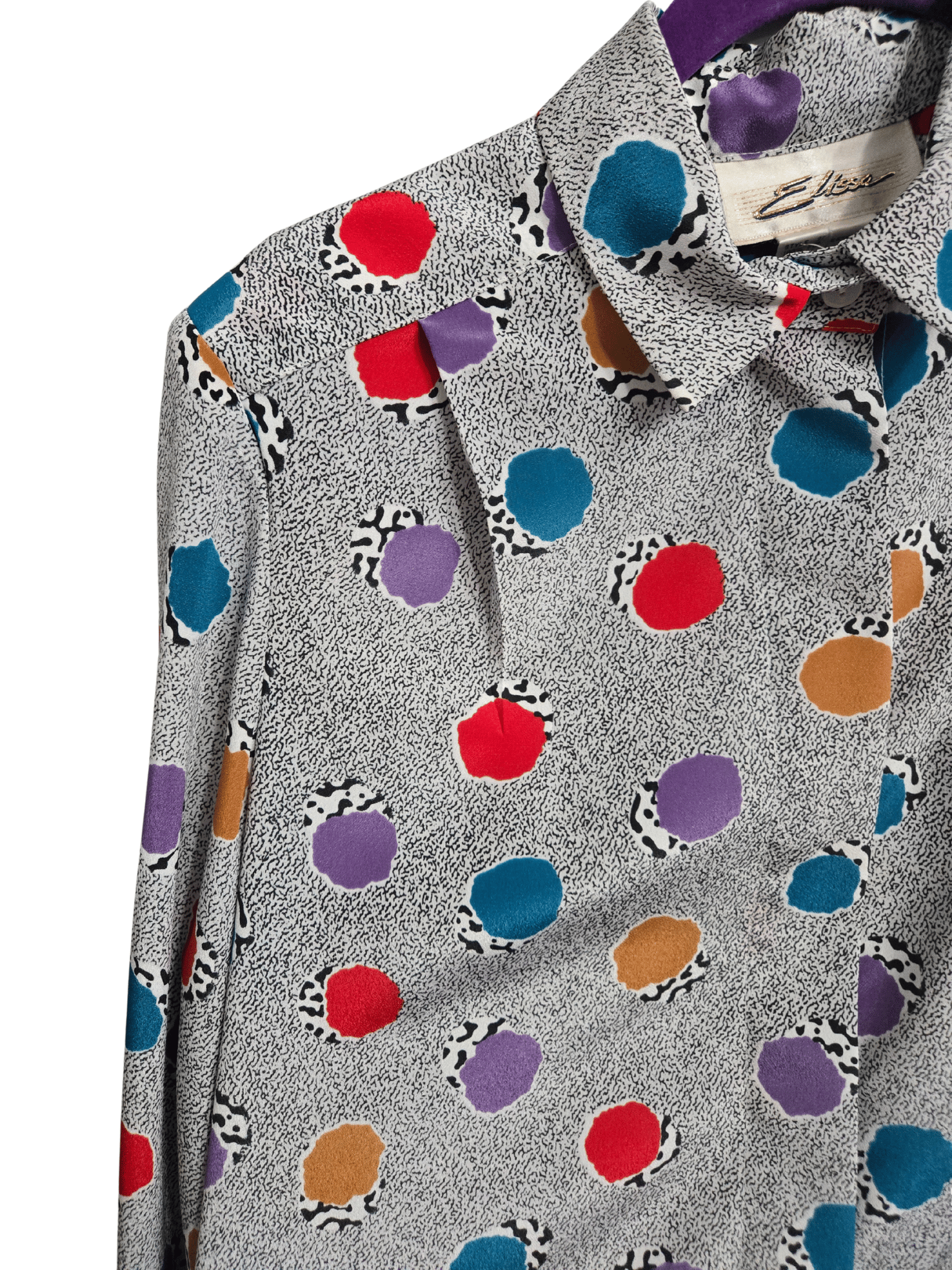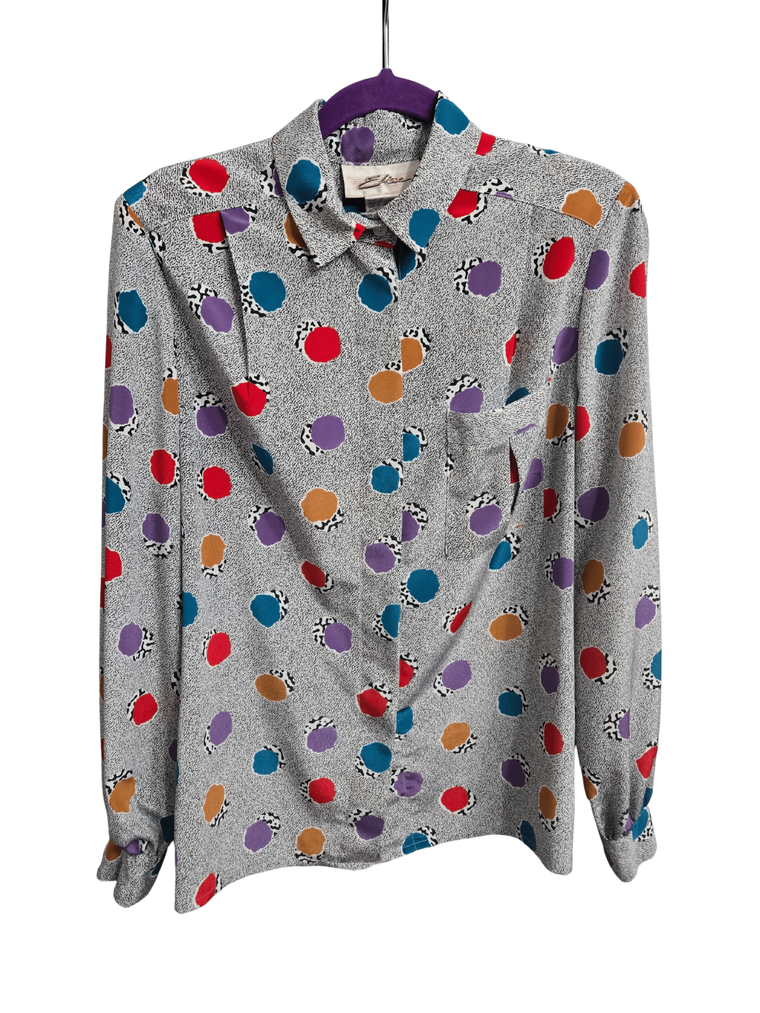 - Black & white print with colorful large dots; 6 buttons; removable shoulder pads; 1 top front pocket