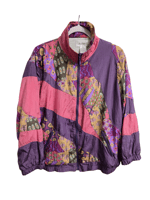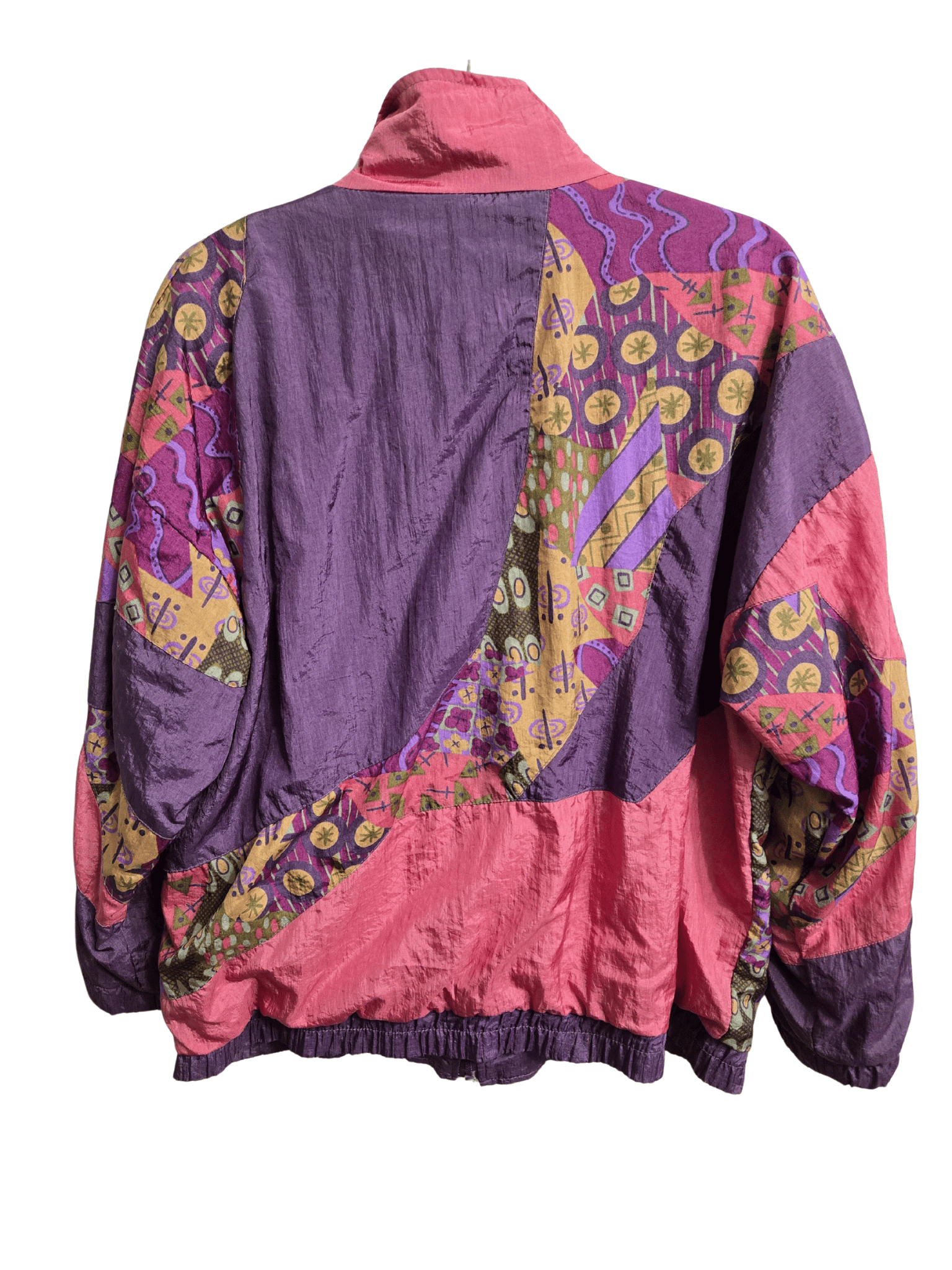 -Purple/Pink/Yellow/Green colors & design; zipper to secure; 2 zipper pockets; lined on inside; elastic bottom and sleeve cuffs