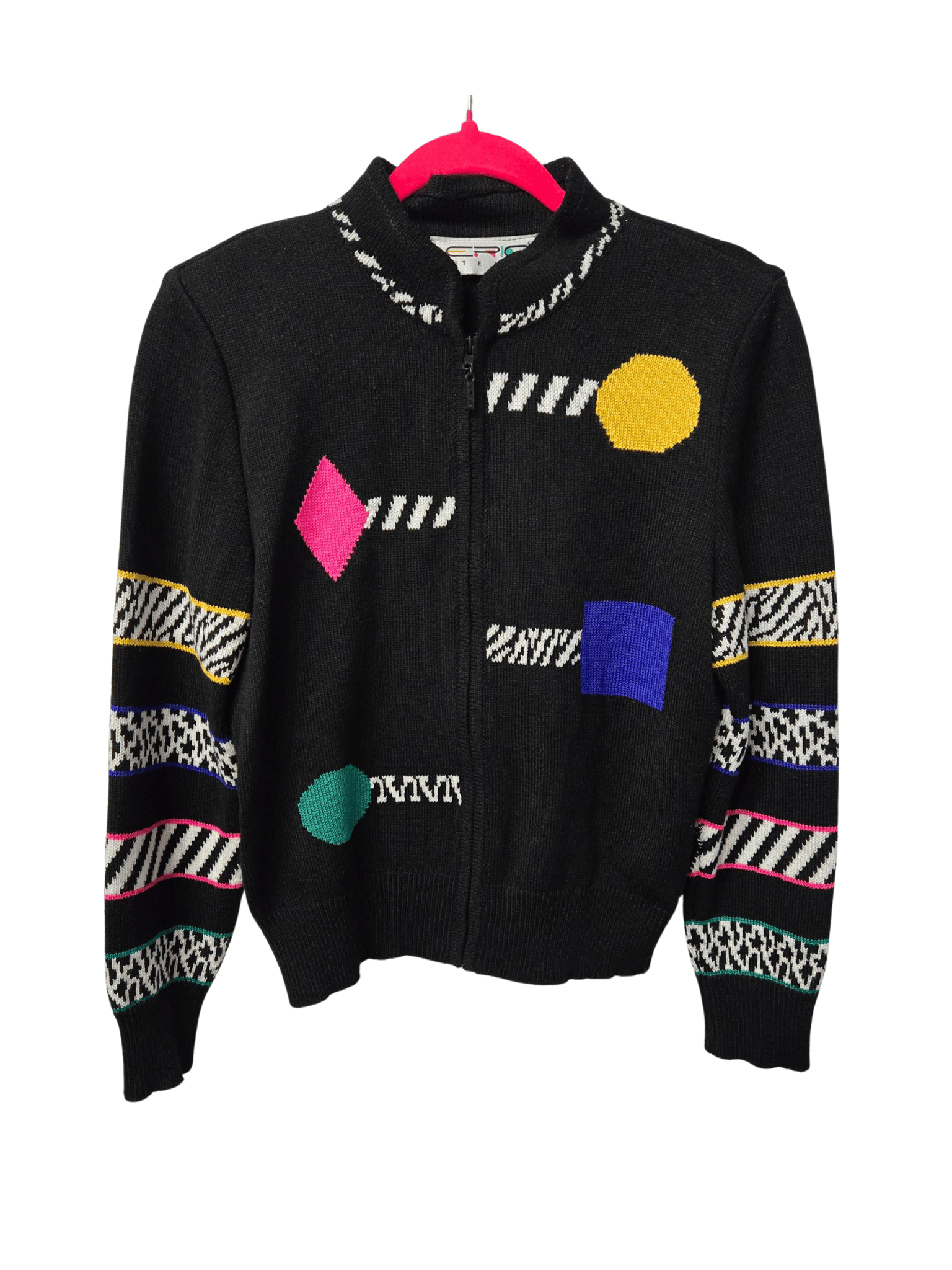 - Blue white/pink/yellow/green/blue shapes & designs; black zipper; solid black back