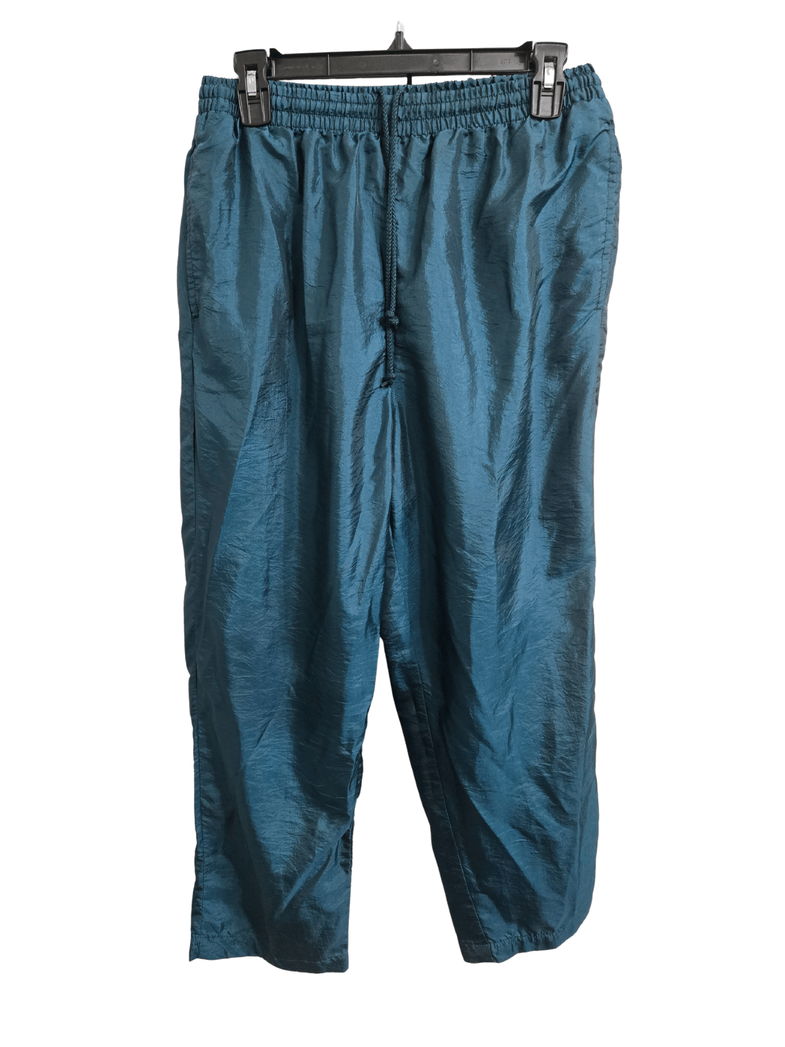 - Pants are solid green; elastic drawn string waist; 2 side pockets; white lining on inside